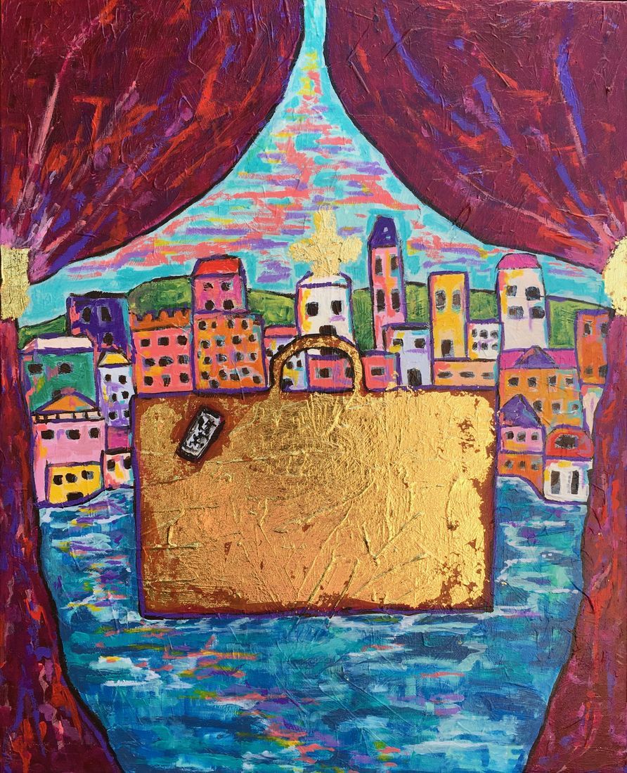 1. "Valise-1967", 2020, Acrylic and Gold Leaf on Canvas, 61 cm x 76 cm.
